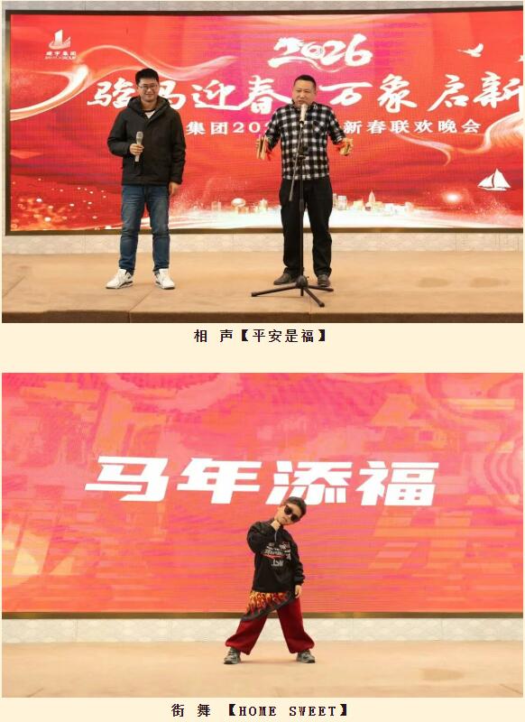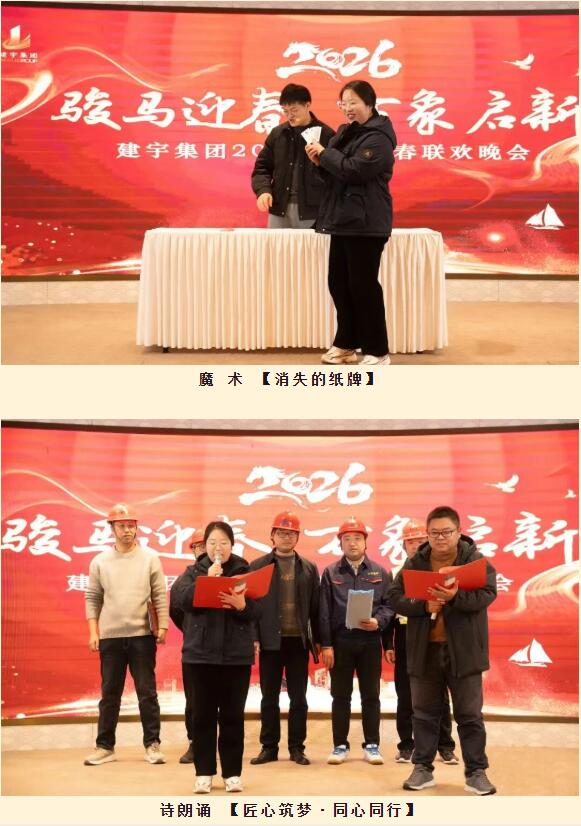 相声《平安是福》、街舞表演《HOME SWEET》、诗朗诵《将进酒-建工狂想曲》、《中年工程人烦恼图鉴》、《匠心筑梦·同心同行》、魔术《消失的纸牌》、口琴独奏《骏马奔驰保边疆》、大合唱《我的中国心》《朋友》《明天会更好》、独唱《你在他乡还好吗》等元素多样、精彩纷呈的节目把年会气氛不断推向高潮,赢得全场热烈掌声与喝彩。