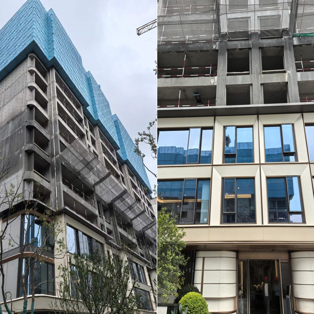 目前,项目是外装饰、二次结构、主体结构的三阶段同步施工,项目部按业主要求,与分包单位精心谋划、组织实施。同时,为保证样板展区访客安全,项目部还创新采用了后挂式挑网等安全措施,进一步提升了施工现场的安全保障水平。从外立面看,项目层次分明,立体感强,展现出独特的建筑美感。